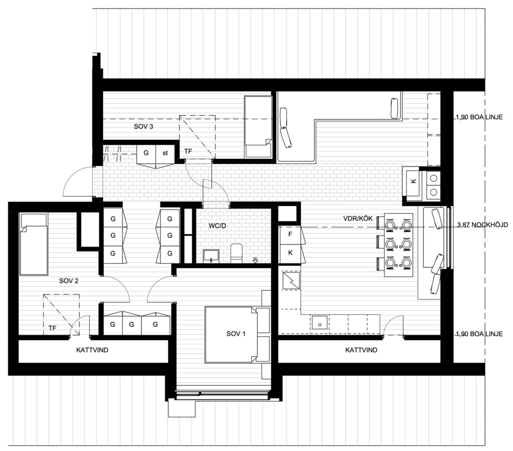 En trivsam vindsvåning med samma välplanerade planlösning som 1201, men med vardagsrummets stora fönster i sydostläge.